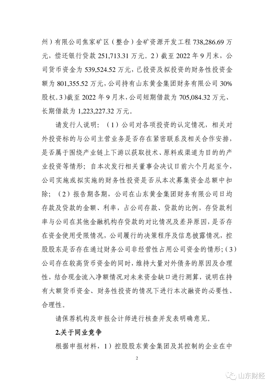 根据申报材料及公开资料,公司本次向特定对象发行股票拟募集资金总额为不超过99亿元,用于山东黄金矿业(莱州)有限公司焦家矿区(整合)金矿资源开发工程73.83亿元,偿还银行贷款25.17亿元。截至2022年9月末,公司货币资金为53.95亿元,已投资及拟投资的财务性投资金额为80.14亿元,公司持有山东黄金集团财务有限公司30%股权。截至2022年9月末,公司短期借款为70.51亿元、长期借款为122.32亿元。