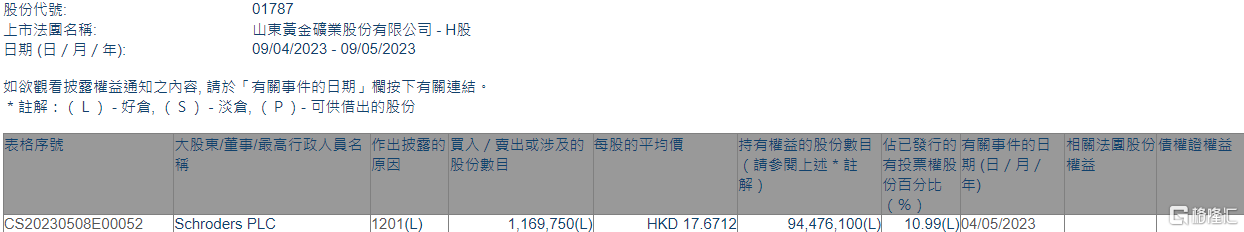 格隆汇5月9日丨根据联交所最新权益披露资料显示,2023年5月4日,山东黄金(01787.HK)遭Schroders PLC在场内以每股均价17.6712港元减持116.975万股,涉资约2067.1万港元。