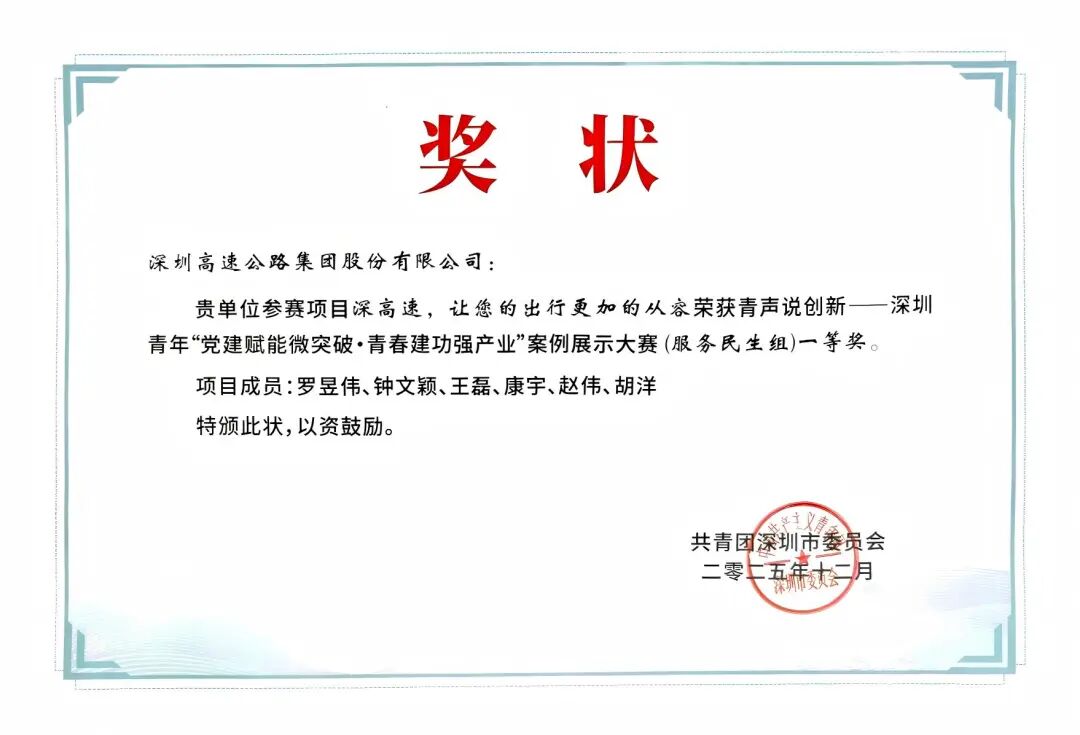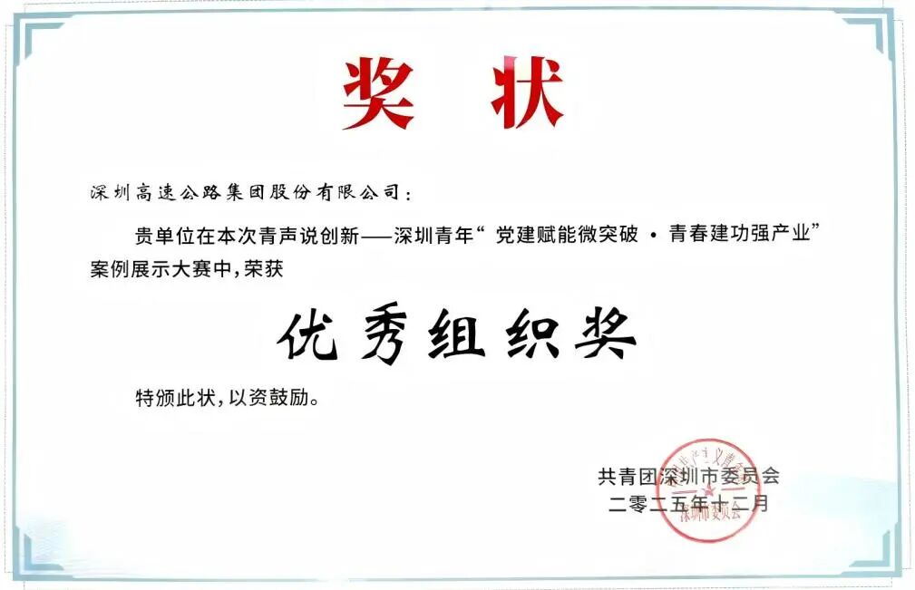 近日,在共青团深圳市委员会指导、深圳市团校主办、深圳市国资委团工委协办的青声说创新——深圳青年“党建赋能微突破·青春建功强产业”案例展示大赛中,深高速载誉而归,一举荣获“优秀组织奖”及两项优秀案例奖!