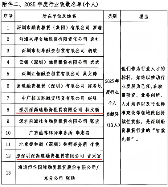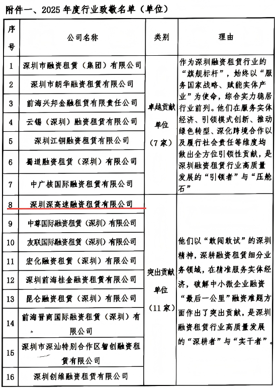 深圳市融资租赁行业协会发布2025年度暨成立十周年荣誉嘉许的决定,融资租赁公司凭借在业务深耕、责任担当与党建引领等方面的卓越表现,成功斩获“2025年度突出贡献单位”和“2025年度行业个人贡献奖”。