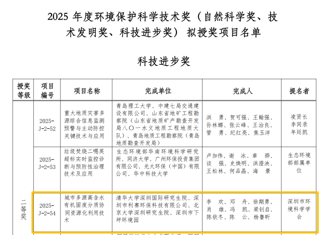 中国环境科学学会发布2025年度环境保护科学技术奖奖励公告。环境公司旗下利赛环保公司与清华大学国际研究生院、北京大学深圳研究生院和深圳市下坪环境园联合申报的“城市多源高含水有机固废分质协同资源化利用技术”项目,成功荣获科技进步奖二等奖。