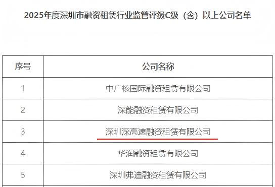 深圳市地方金融管理局公布2025年度融资租赁行业监管评级结果,融资租赁公司凭借卓越综合实力与稳健经营态势,再度斩获A级认证,在全市130余家参评企业中位列前三。