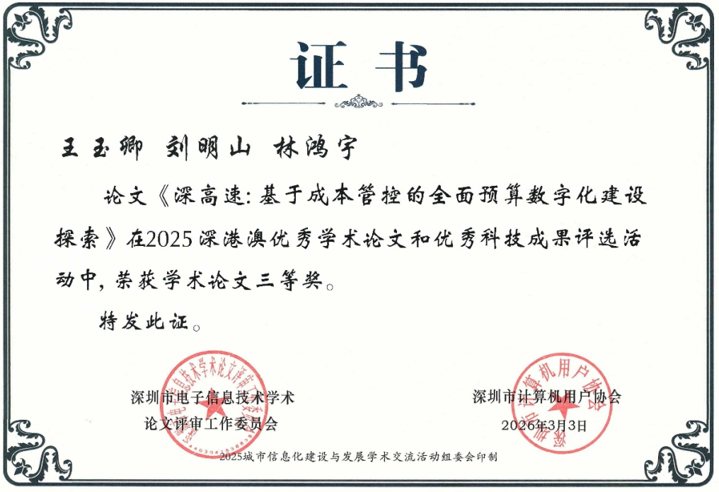 近日,2025年深港澳优秀学术论文和优秀科技成果评选结果正式揭晓。深高速报送的论文《深高速:基于成本管控的全面预算数字化建设探索》获评学术论文三等奖。