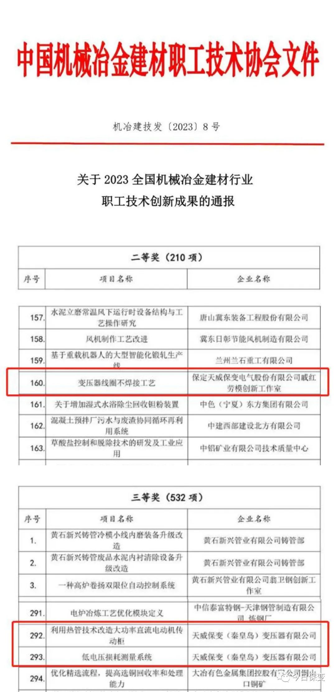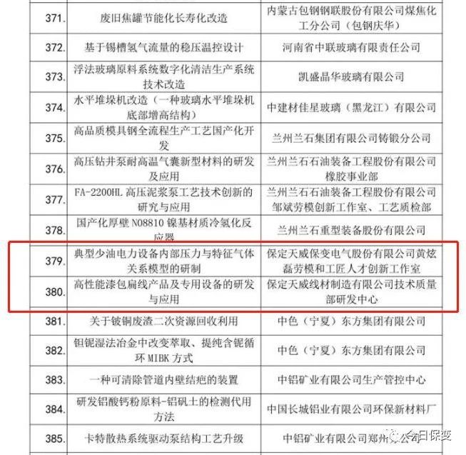 近日,中国机械冶金建材职工技术协会发文通报,保变电气黄炫磊创新工作室和秦变公司创新工作室荣获“全国机械冶金建材行业示范性创新工作室”;保变电气总装车间李勇、秦变公司孙辰荣获“全国机械冶金建材行业工匠”称号;保变电气戚红创新工作室《变压器线圈不焊接工艺》项目荣获“全国机械冶金建材行业职工技术创新成果二等奖”,黄炫磊创新工作室《典型少油电力设备内部压力与特征气体关系模型的研制》、线材公司技术质量部研发中心的《高性能漆包线产品及专用设备的研发与应用》、秦变公司的《利用热管技术改造大功率直流电动机传动柜》和《低电压损耗测量系统》荣获“全国机械冶金建材行业职工技术创新成果三等奖”。