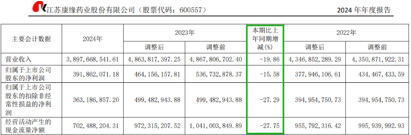 2024年年报,康缘药业主要业绩指标全面下滑。