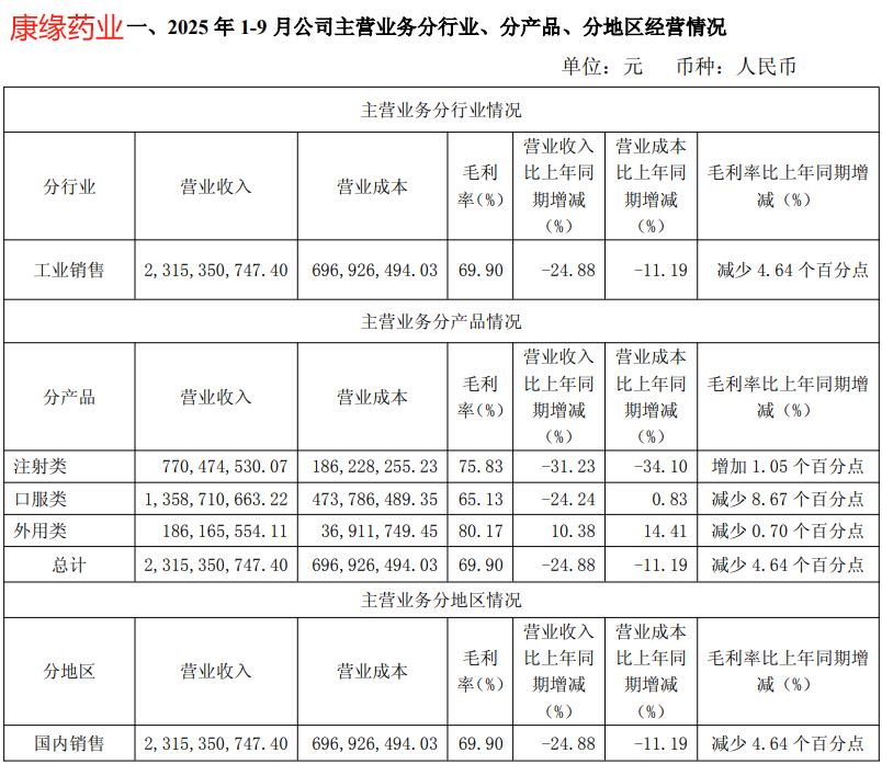 2025年前三季度,康缘药业业绩指标“加速”下滑。