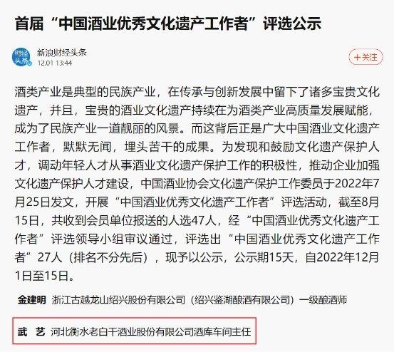 近日,衡水老白干酒(600559)业股份有限公司酒库车间主任武艺,荣获“中国酒业优秀文化遗产工作者”荣誉。这份荣誉既是对他多年来致力于白酒酒文化遗产保护的肯定,也是对他继续从事白酒文化遗产保护的鞭策和激励。