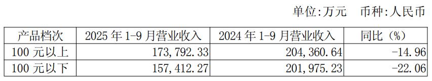 公告显示,按产品档次分类,2025年1-9月,老白干酒100元以上产品实现营收17.38亿元,相比上年同期的20.44亿元减少14.96%;100元以下产品实现营收15.74亿元,相比去年同期的20.20亿元减少22.06%。