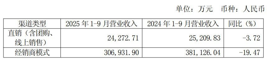 按销售渠道分类,2025年1-9月,老白干酒直销(含团购、线上销售)实现营收2.43亿元,相比去年同期的2.52亿元下降3.72%;经销商模式实现营业收入30.69亿元,相比去年同期的38.11亿元下降19.47%。2025年前三季度,老白干酒仍以线下销售(经销商模式)为主,且线下销售的营收增速降幅远超线上。