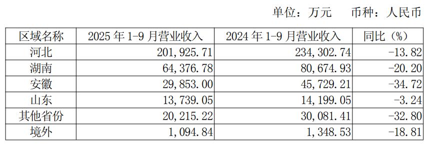 按地区分类,2025年1-9月,老白干酒的主战场仍在发源地河北,且公司在各个市场的营收增速均出现不同程度下滑。以公司前四大市场河北、湖南、安徽、山东为例,对应营收分别为20.19亿元、6.44亿元、2.99亿元、1.37亿元,同比分别下降13.82%、20.20%、34.72%、3.24%。