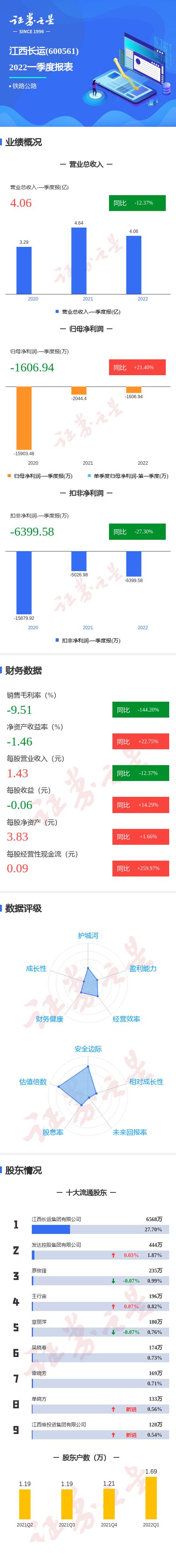 江西长运2022一季报显示,公司主营收入4.07亿元,同比下降12.37%;归母净利润-1606.94万元,同比上升21.4%;扣非净利润-6399.58万元,同比下降27.3%;其中2022年第一季度,公司单季度主营收入4.07亿元,同比下降12.37%;单季度归母净利润-1606.94万元,同比上升21.4%;单季度扣非净利润-6399.58万元,同比下降27.3%;负债率74.05%,投资收益3699.96万元,财务费用3046.51万元,毛利率-9.51%。