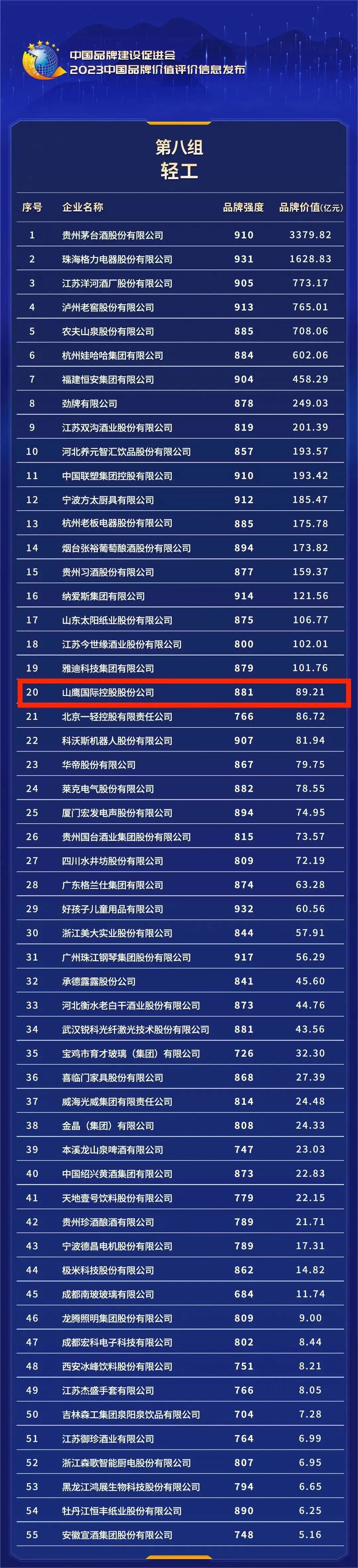山鹰国际控股股份公司以89.21亿元的品牌价值荣登榜单,品牌强度881,位列全国轻工企业品牌第20名。
