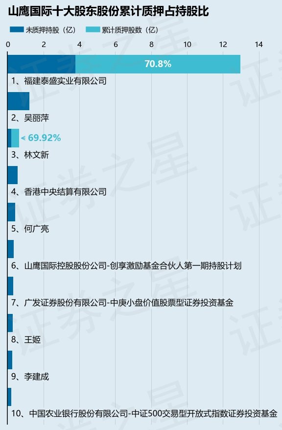 截止本公告日,股东福建泰盛实业有限公司已累计质押股份9.19亿股,占其持股总数的70.8%,股东林文新已累计质押股份4489.9万股,占其持股总数的69.92%。本次质押后山鹰国际十大股东的累计质押股份占持股比例见下图: