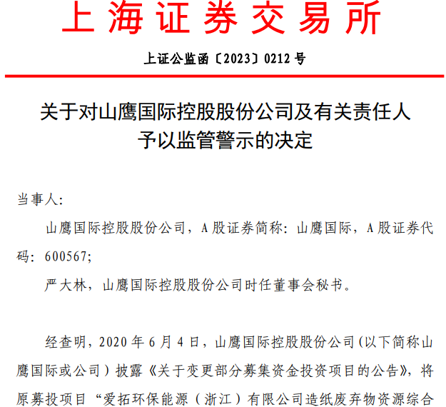 10月13日,上交所发布公告,山鹰国际控股股份公司及其时任董秘严大林因未及时披露募投项目延期事项,被上交所予以监管警示。