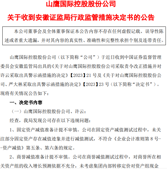 山鹰国际7月13日发布公告,公司于近日收到安徽证监局出具的《关于对山鹰国际控股股份公司采取责令改正措施并对许云采取出具警示函措施的决定》及《关于对山鹰国际控股股份公司、严大林采取出具警示函措施的决定》。经查,公司存在:固定资产减值准备计提不审慎、商誉减值准备计提不审慎的违规问题,同时,存在政府补助未及时披露、定期报告财务信息披露不准确的违规问题。