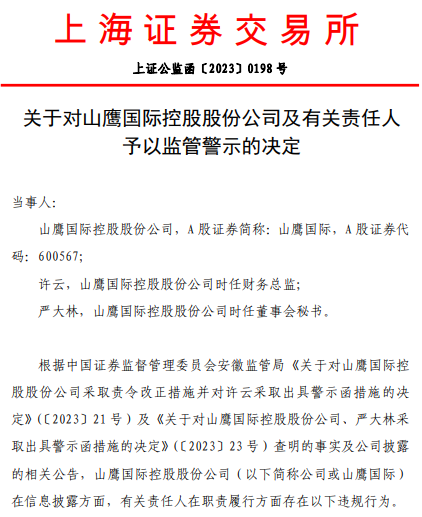 9月20日,上交所发布《关于对山鹰国际控股股份公司及有关责任人予以监管警示的决定》,对公司及时任财务总监、时任董秘出具警示函。
