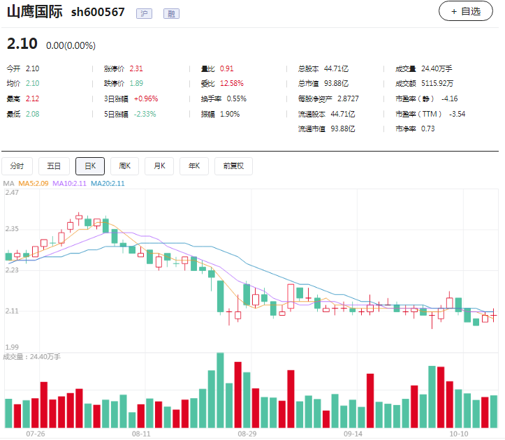 二级市场方面,山鹰国际股价不断走低,市值已经跌至百亿元以下。截至10月13日收盘,公司股价为2.10元/股,总市值93.88亿元。