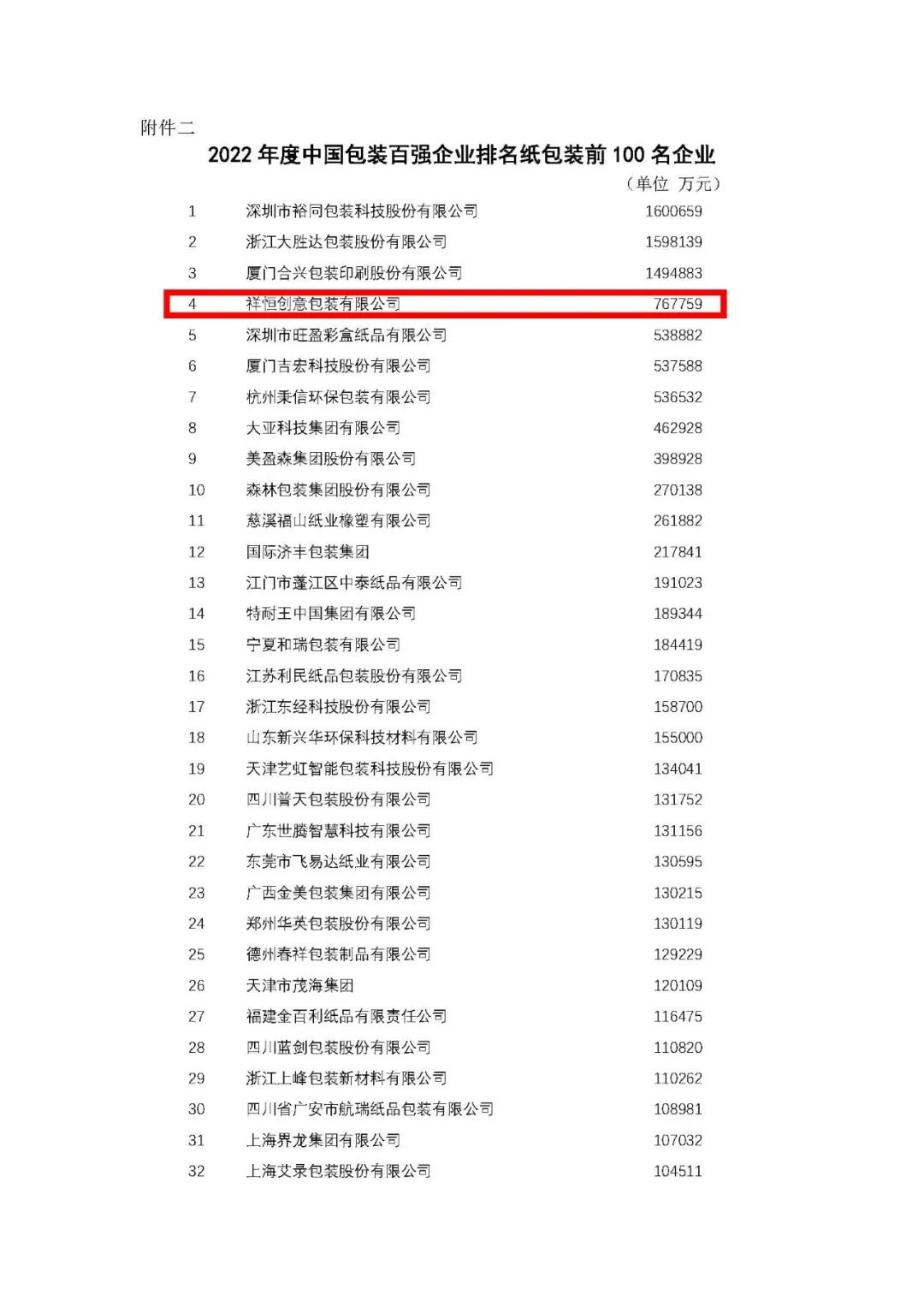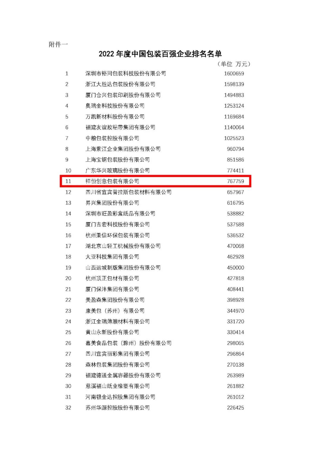 2023年11月,山鹰国际旗下子公司祥恒创意包装有限公司代表山鹰国际包装板块参与“2022年度中国包装百强企业”评比。经中国包装联合会评定,在塑料包装、金属包装、玻璃包装等众多类型包装企业中,祥恒创意包装有限公司最终荣获2022年度中国包装百强企业第11名,纸包装领域第4名。