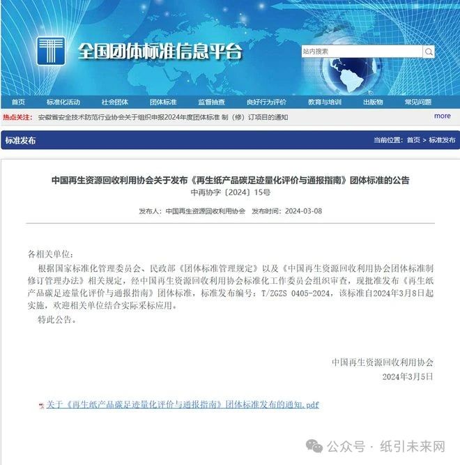 近日,经中国再生资源回收利用协会标准委员会确认,由山鹰国际参编的团体标准《再生纸产品碳足迹量化评价与通报指南》(T/ZGZS 0405-2024)符合标准要求,准许发布并实施。