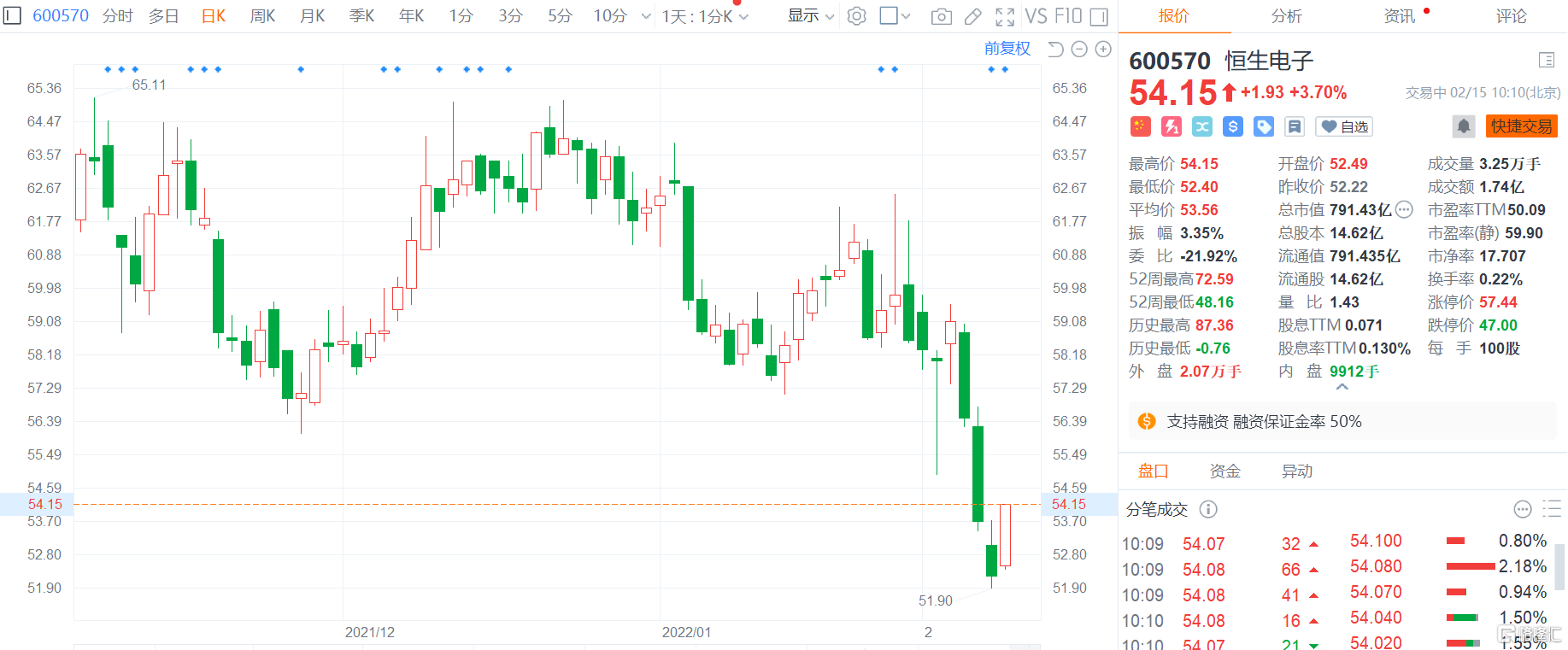 格隆汇2月15日丨恒生电子(600570.SH)涨约4%,报54.15元,总市值791亿元。