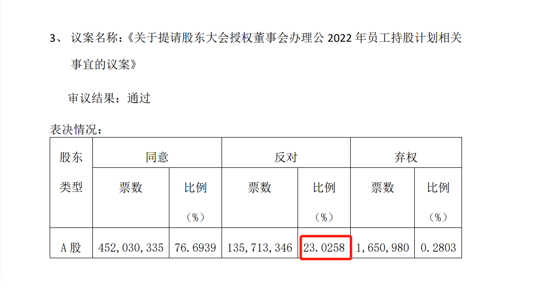 7月20日,恒生电子股份有限公司(简称:恒生电子)发布了2022年第二次临时股东大会决议公告,公司以76.69%的同意率,通过了关于公司2022年员工持股计划的议案,其中,反对票占比高达23.03%,其余约0.28%为弃权票。