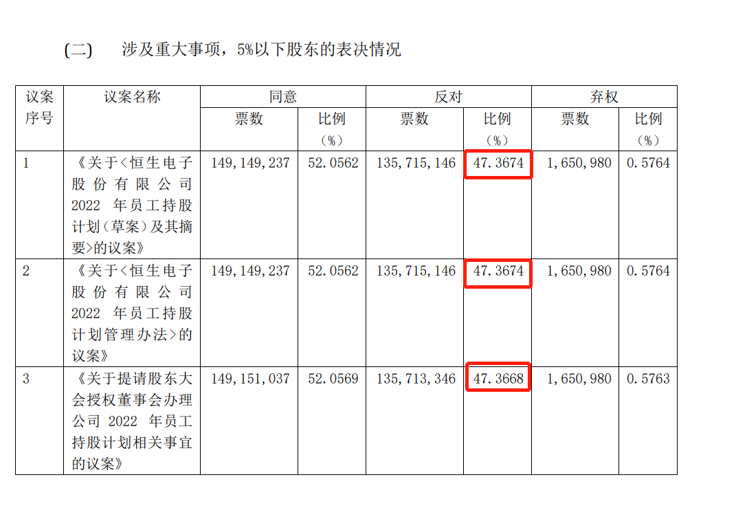 从公告披露的具体信息来看,公司持股5%以下股东对此次员工持股计划(草案)相关议案的投票反对票占比均超过47%,接近半数。