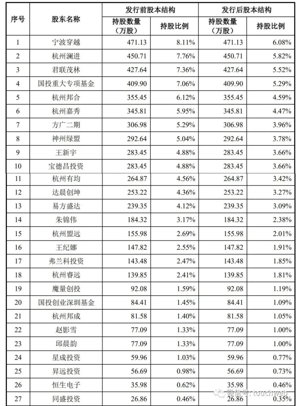 IPO后,宁波穿越持股为6.08%,杭州澜进持股为5.82%,君联茂林持股为5.52%,国投重大专项基金持股为5.29%,杭州邦合持股为4.59%,杭州嘉秀持股为4.47%,方广二期持股为3.96%,神州绿盟持股为3.78%;