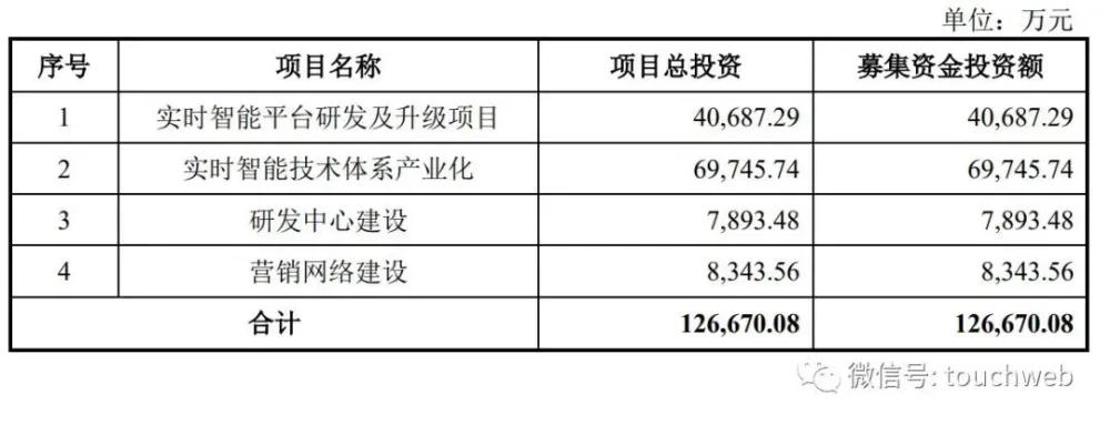 其中,4.07亿用于实时智能平台研发及升级项目,6.97亿用于实时智能技术体系产业化,7893万用于研发中心建设,8344万用于营销网络建设。