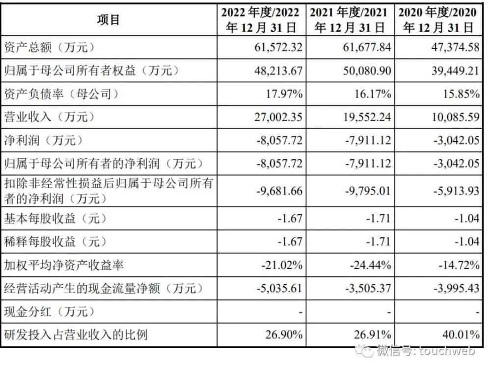 招股书显示,邦盛科技2020年、2021年、2022年营收分别为1亿元、1.96亿元、2.7亿元;净亏损分别为3042万元、7911万元、8057.7万元;扣非后净亏损分别为5913.9万元、9795万元、9681.66万元。