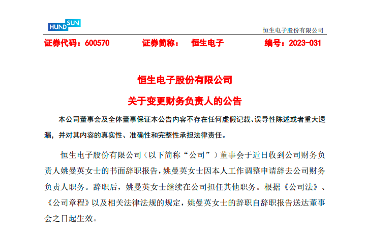 昨日,恒生电子股份有限公司公告称,董事会收到公司财务负责人姚曼英的书面辞职报告,因其本人工作调整申请辞去财务负责人职务。