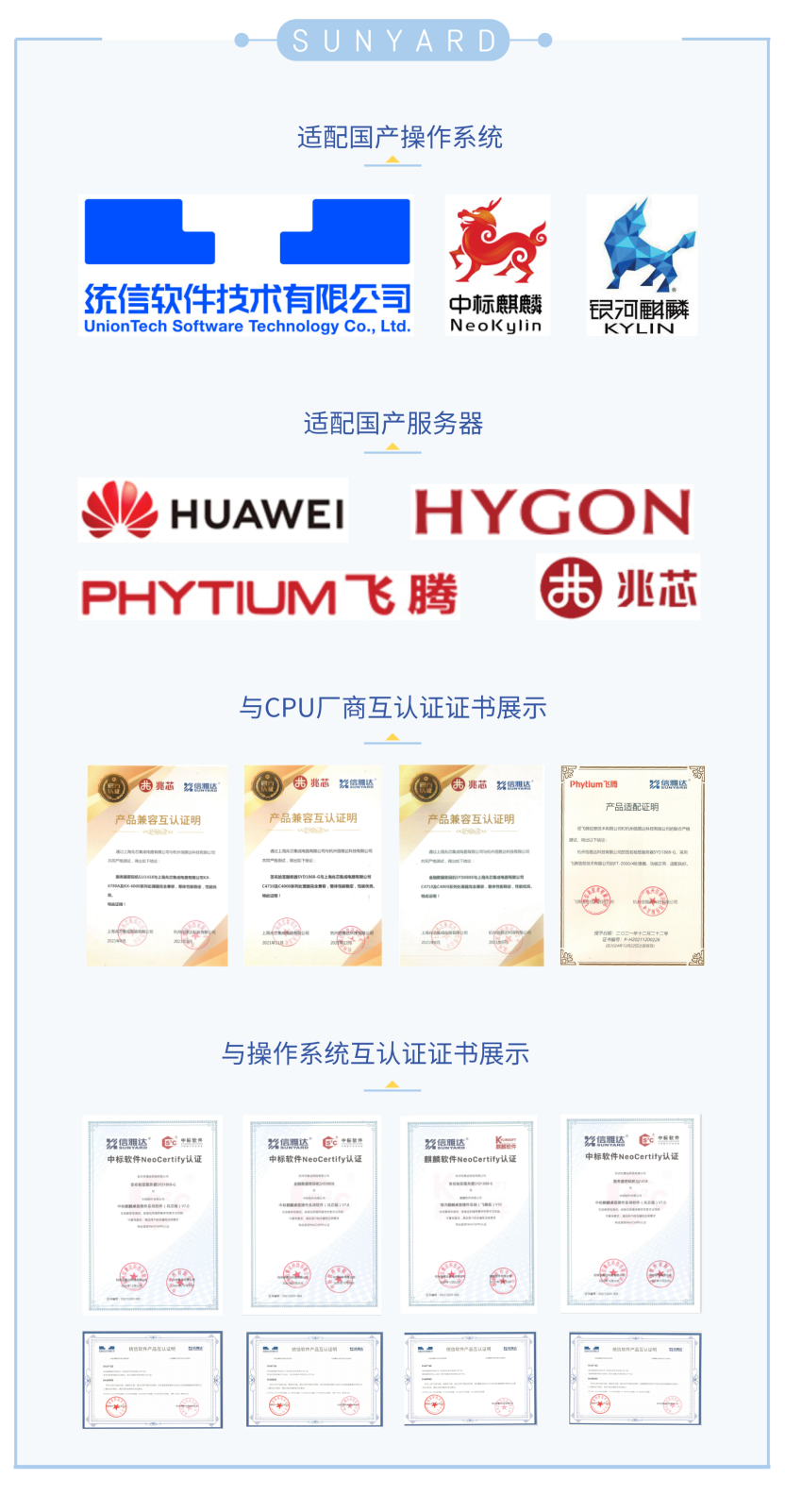 该类设备积极进行国产化适配改造,可在鲲鹏+国产操作系统、海光+国产操作系统、飞腾+国产操作系统、兆芯+国产操作系统等等环境下进行使用,都做了适配兼容,为客户提供全面的国产化替代方案,先后已取得了多项兼容适配互认证证书。