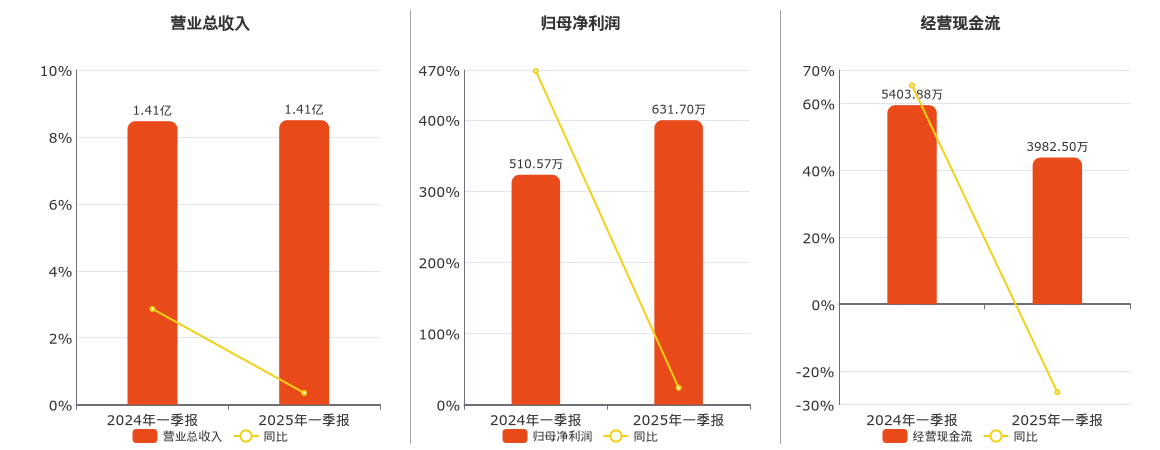 公司营业总收入为1.41亿元,较去年同报告期营业总收入增加49.43万元,实现5年连续上涨,同比较去年同期上涨0.35%。归母净利润为631.70万元,较去年同报告期归母净利润增加121.12万元,实现5年连续上涨,同比较去年同期上涨23.72%。经营活动现金净流入为3982.50万元。