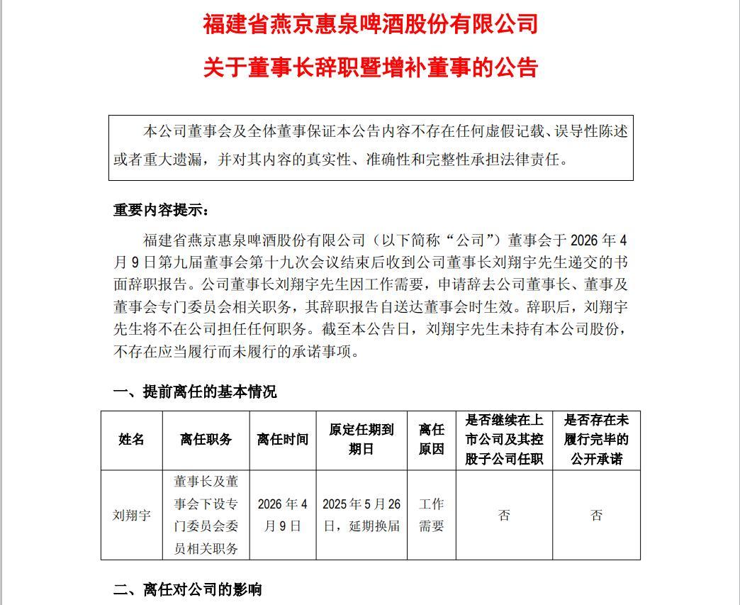 4 月 12 日,福建省燕京惠泉啤酒股份有限公司(600573)发布公告,公司董事会于 4 月 9 日收到董事长刘翔宇递交的书面辞职报告,其因“工作需要”申请辞去公司董事长、董事及董事会专门委员会相关职务,辞职报告自送达董事会时生效,辞任后刘翔宇将不在公司担任任何职务。