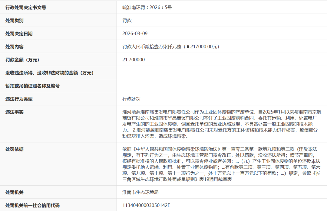 近日,据“信用安徽”公开披露3月9日行政处罚信息,因未对受托方的主体资格和技术能力进行核实,致使部分粉煤灰排入沟渠,造成环境污染,淮河能源淮南潘集发电有限责任公司被处以罚款21.7万元。行政处罚决定书文号是皖淮南环罚﹝2026﹞5号。