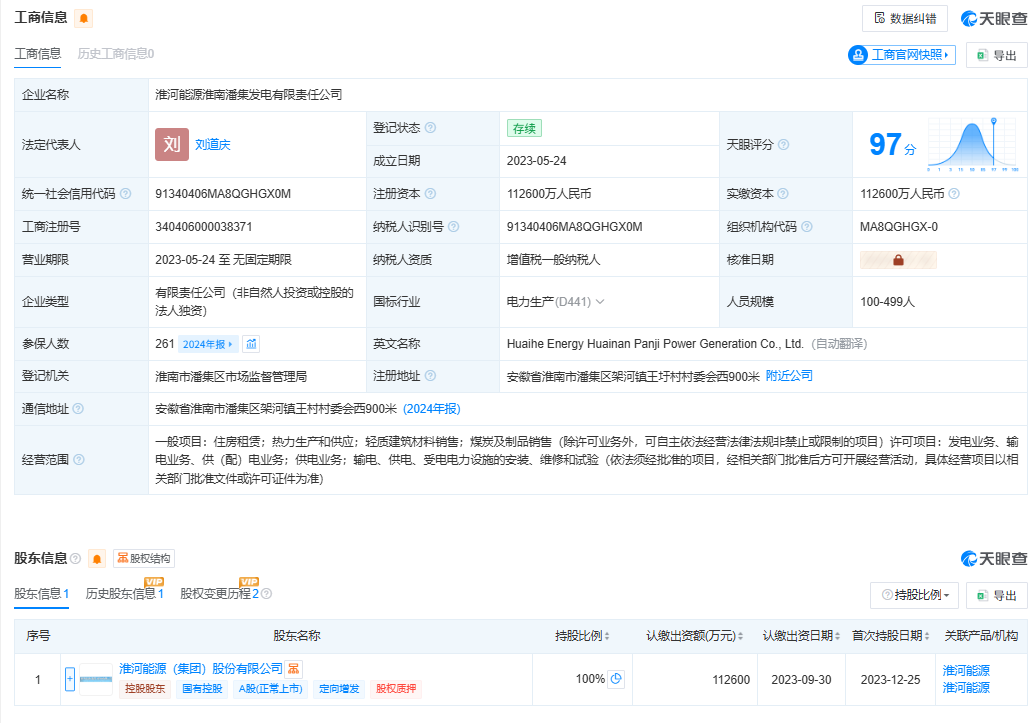 股东信息显示,淮河能源淮南潘集发电有限责任公司由上市公司淮河能源(集团)股份有限公司全资控股。