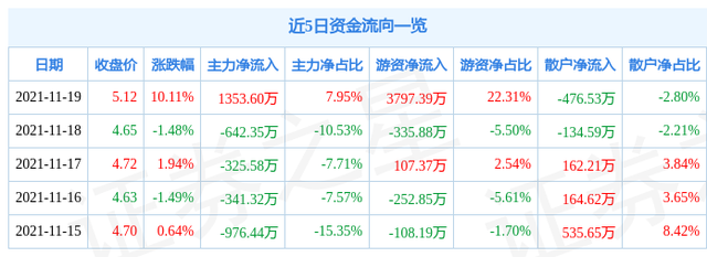 资金流向数据方面,当日主力资金净流入1353.6万元,游资资金净流入3797.39万元,散户资金净流出476.53万元。近5日资金流向一览见下表: