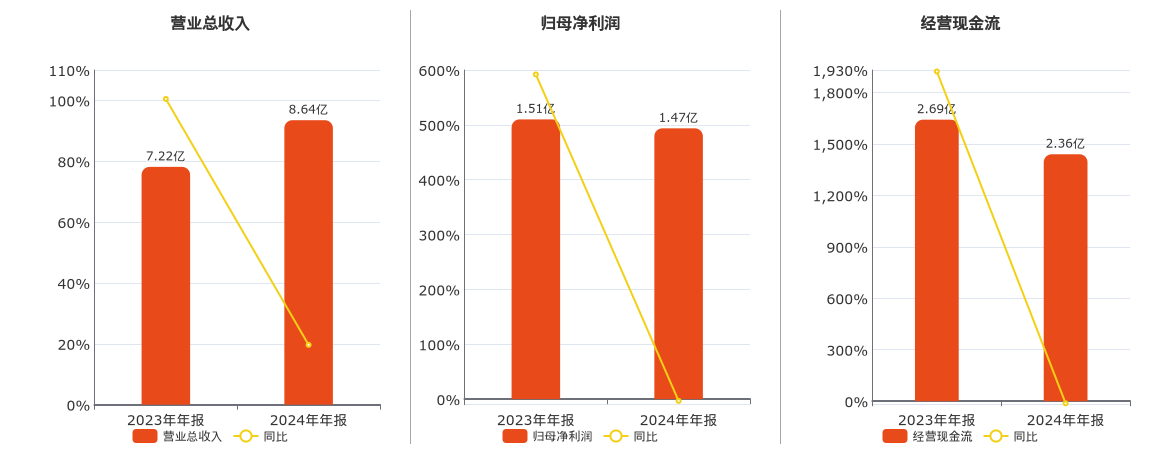 公司营业总收入为8.64亿元。归母净利润为1.47亿元,较去年同报告期归母净利润减少474.61万元,同比较去年同期下降3.14%。经营活动现金净流入为2.36亿元,较去年同报告期经营活动现金净流入减少7877.97万元,同比较去年同期下降25.00%。