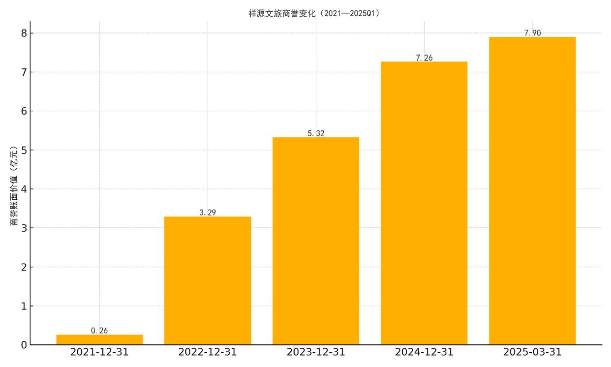 与债务同步激增的,是账面上的商誉。由于并购多采用溢价收购,祥源文旅的商誉从2021年末的0.48亿元,飙升至2025年一季度末的7.90亿元,三年多时间里增长了超过16倍。截至2025年一季度末,商誉占公司净资产的比例高达25.69%。
