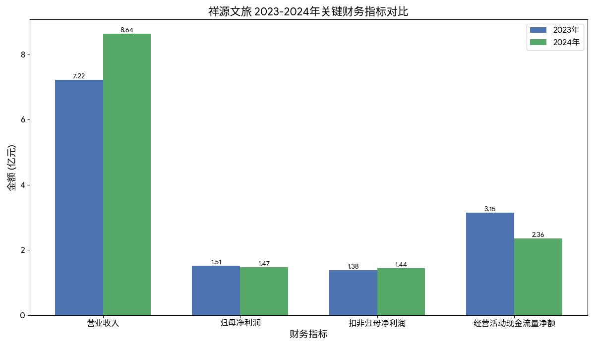 祥源文旅2024年年度报告显示,公司全年实现营业收入8.64亿元,同比增长19.64%。然而,与收入增长形成鲜明对比的是,归属于上市公司股东的净利润为1.47亿元,同比下降3.14%。更为关键的经营质量指标——经营活动产生的现金流量净额,为2.36亿元,同比大幅下降25.00%。
