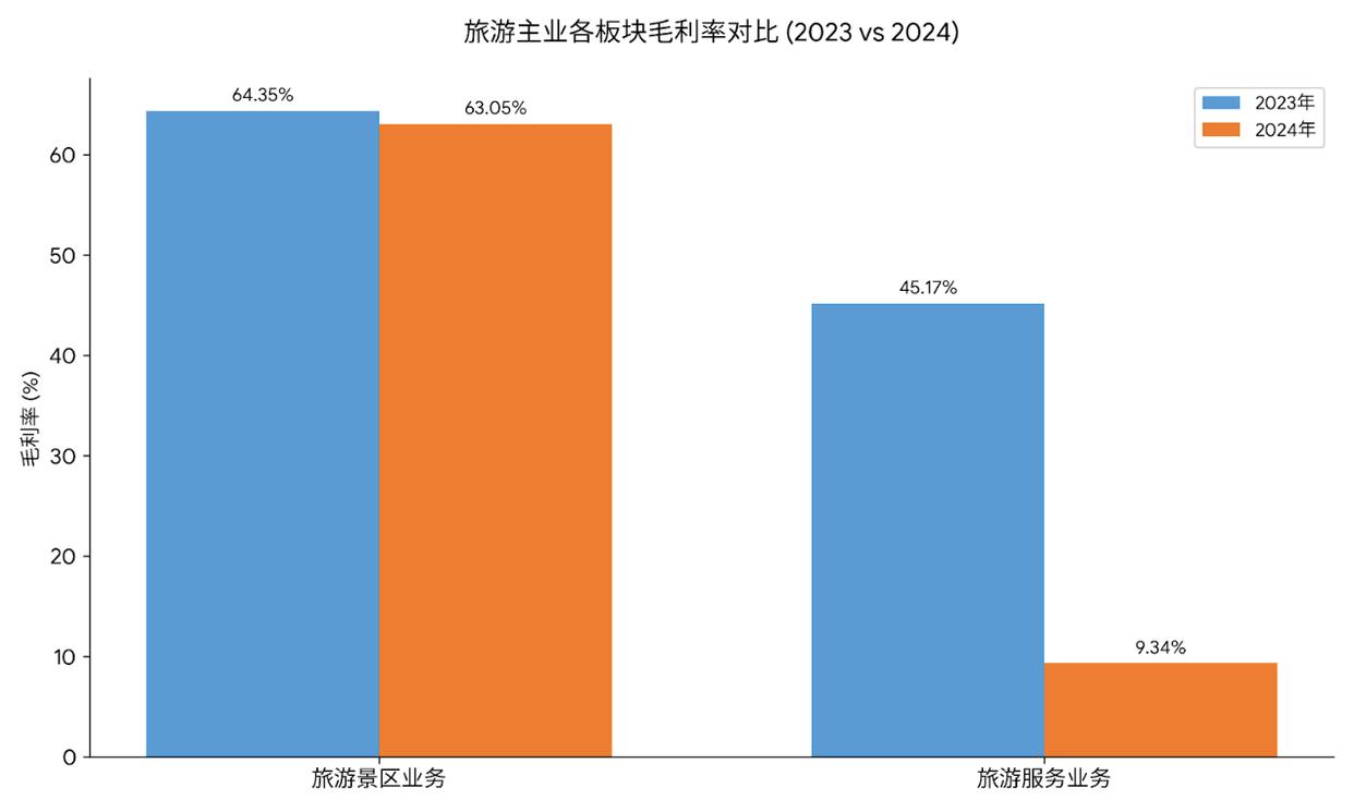 其次,被寄予厚望的旅游主业,其盈利能力也全面下滑。2024年,占总营收63%的旅游景区业务,毛利率下滑1.3个百分点至63.05%;旅游度假业务毛利率减少21.3个百分点;而旅游服务业务的毛利率更是从前一年的45.17%暴跌35.83个百分点,仅剩9.34%。