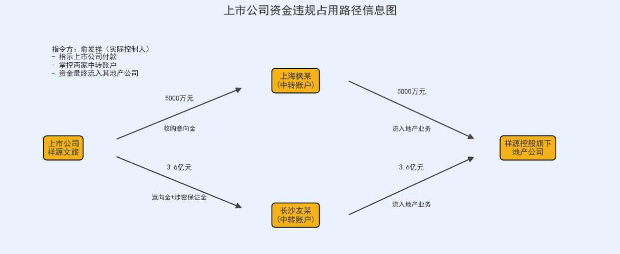 三亚船务收购意向金及保证金:2022年6月,祥源文旅与另一家公司签订意向协议,拟收购三亚某海船务股权,并约定将总计3.6亿元的意向金和“涉密保证金”支付至“长沙友某”的公司账户,该账户同样为俞发祥控制。资金随后被转入祥源控股及其关联的地产公司使用。这笔资金分三次转出,并在数月后协议终止时归还。