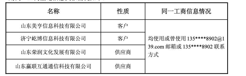 类似的情况还出现在祥源文旅的前五大客户和供应商里:济宁屹博信息科技有限公司(下称“济宁屹博”)和山东赢联互通通信科技有限公司(下称“山东赢联”)也使用相同的工商电话,且济宁屹博也出现在2019年的共用相同邮箱一栏。