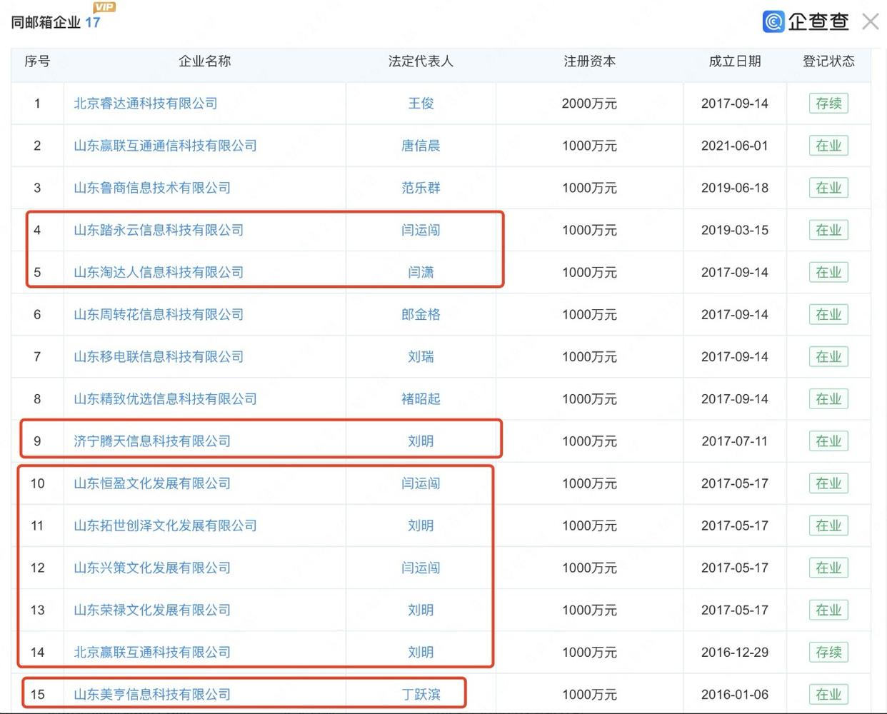 这种共用联系方式的情况,往往容易被视为同一实控人旗下公司的常规操作。《财中社》梳理发现,根据数据,早在2019 年,就有17家公司与山东美亨共用同一邮箱,其中5家赫然是祥源文旅的第一大供应商山东荣润大股东刘明担任法定代表人的公司,另外3家公司由山东荣润二股东闫运闯担任法定代表人。