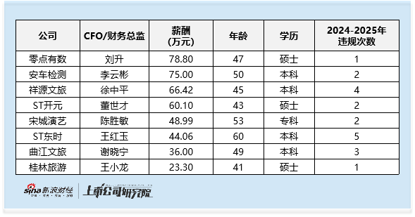 社会服务行业CFO中,共有8名在2024-2025年出现违规情况,并收到监管警示函或通报批评。其中ST东时(维权)的王红玉以5次违规位居榜首,并被处以150万元罚款;另外祥源文旅(维权)的徐中平也出现4次违规情况,被处以80万元罚款。