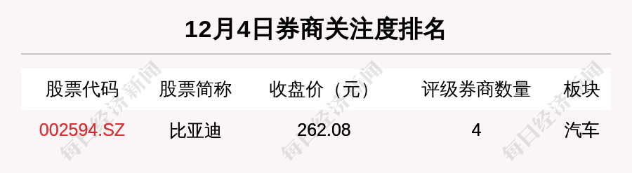 从券商对个股的关注程度来看,有1只个股获得多家券商关注,券商关注数量排名居前的个股是比亚迪(002594.SZ)。