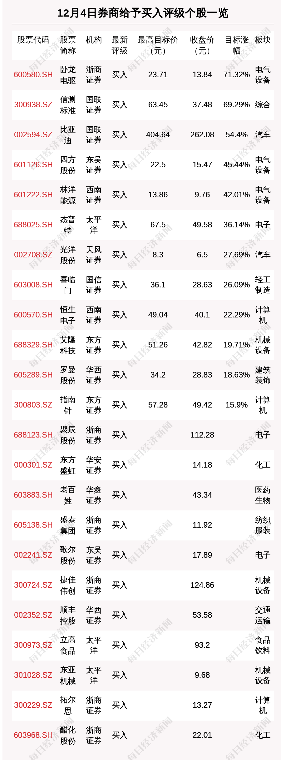 12月4日,券商给予评级的个股数共有35只,获得买入评级的个股数共有23只。在公布了目标价格的12只个股中,按照最新收盘价计算,预期涨幅排名居前的个股是卧龙电驱(600580.SH)、信测标准(300938.SZ)、比亚迪(002594.SZ),预期涨幅分别是71.32%、69.29%、54.4%。