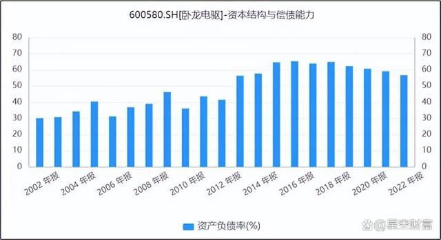 净利率仅个位数,要维持疯狂并购的节奏,靠自己肯定不够。自上市以来,卧龙的资产负债率节节攀升。截至2022年底,已近60%。短期来看,卧龙的速动比率常年低于1,短期偿债压力山大。