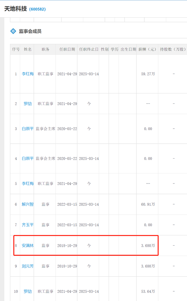 据天地科技公开信息披露,自2018年10月29日,一位名为安满林的自然人便开始出任其监事会监事一职至今。