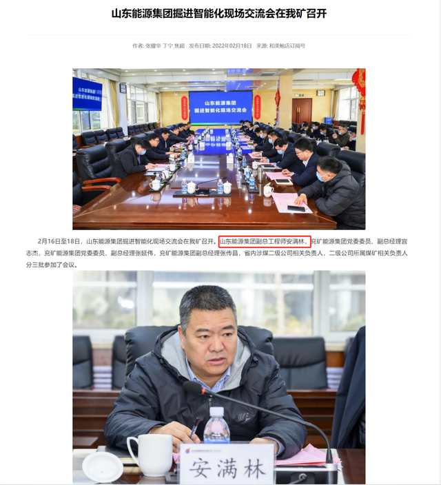 2022年2月,在山东兖矿集团下属鲍店煤矿的官方首页上,刊发了一篇名为《山东能源集团掘进智能化现场交流会在我矿召开》的文章,该文章称“2月16日至18日,山东能源集团掘进智能化现场交流会在我矿召开。山东能源集团副总工程师安满林,兖矿能源集团党委委员、副总经理宫志杰,兖矿能源集团党委委员、副总经理张延伟,兖矿能源集团副总经理张传昌,省内涉煤二级公司相关负责人,二级公司所属煤矿相关负责人分三批参加了会议”,并表示在会上安满林传达了山东能源集团党委常委、副总经理刘健在山东能源集团掘进智能化现场推进会上的讲话精神,要求各单位认真传达贯彻会议精神,切实发挥智能化的作用,不再仅仅停留在宣传上、材料上。要实事求是、站在职工的立场上去处理问题,设身处地为职工解决实际生产中的问题,通过智能化建设实现真正的减人提效,营造一个安全的作业环境。