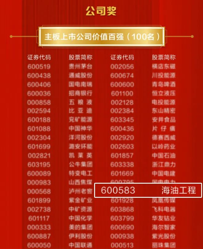 11月28日,2023中国明星基金暨上市公司价值双峰论坛揭晓第十七届中国上市公司价值评选获奖名单,海油工程荣获“中国主板上市公司价值百强奖”,标志着公司规模、经营治理、盈利水平等多方面发展成效获得资本市场和业界认可,进一步彰显了公司综合竞争实力。